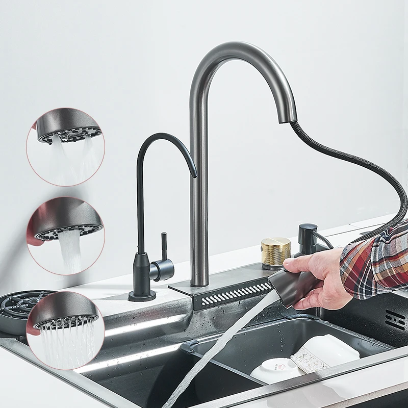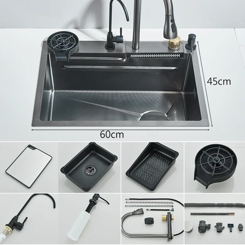 304 Stainless Steel Waterfall Kitchen Sink Large Single Slot Integrated 60X45cm Faucet Set Soap Dispenser/Pure Water/Cup Washer