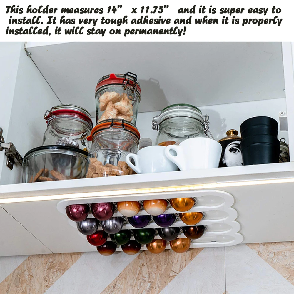 Mount it the way you want it, under the cabinet if you prefer a low profile organizer, the inside of the cabinet door next to your coffee mugs & cups, or on the wall to turn it into a coffee bar!