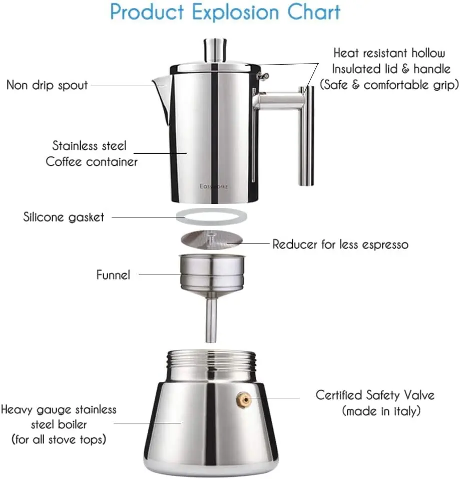 Easyworkz has created this high grade stovetop espresso maker with modern manufacturing technology and crafted to meet the top standards in this industry.