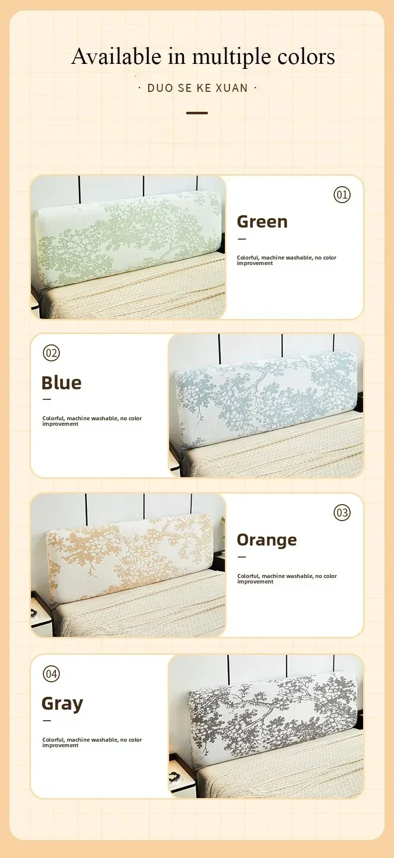 1.Fabric:Headboard cover is made of Jacquard fabric, skin-friendly, soft and comfortable, firm fabric, not easy to fade.