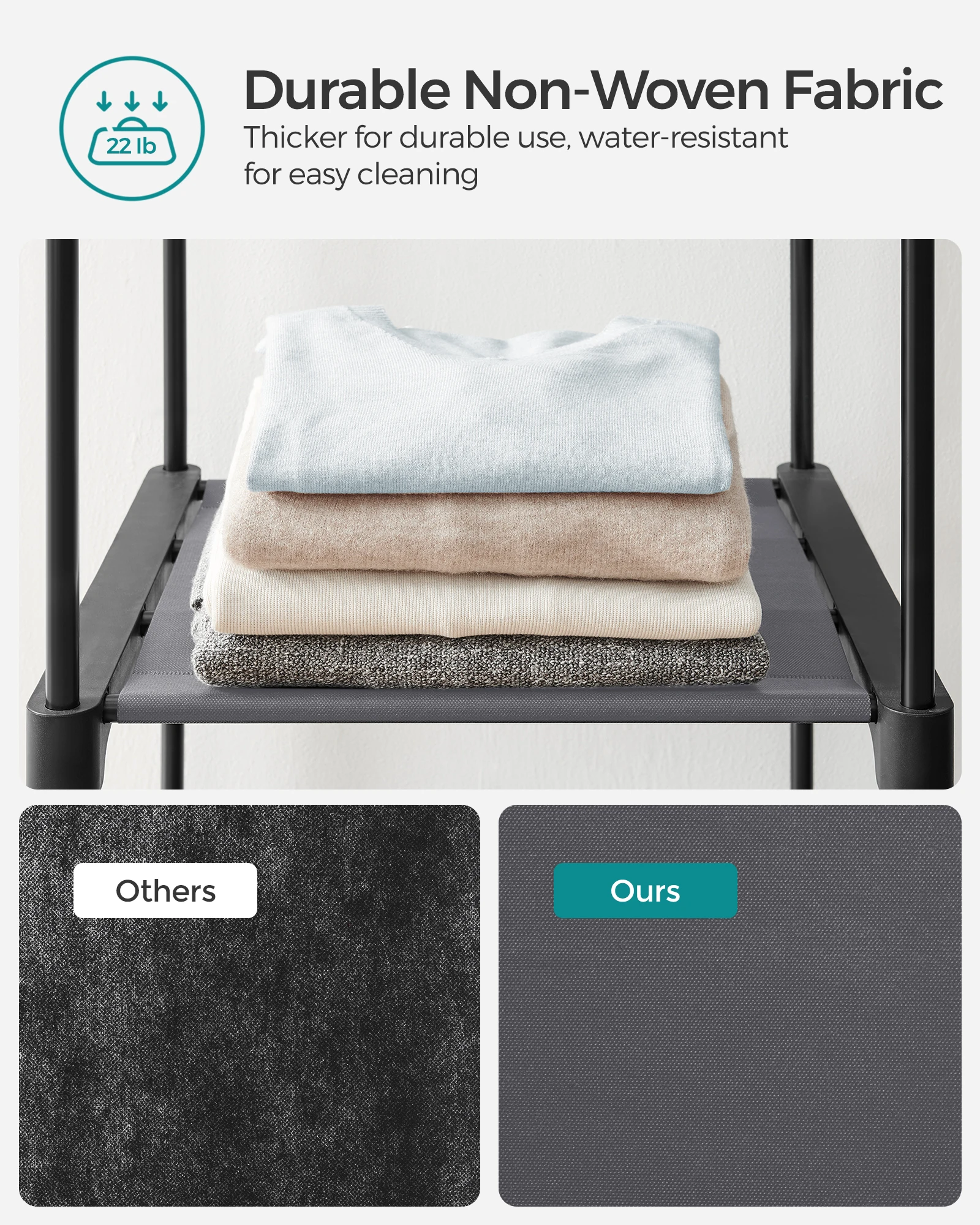 - [It Has the Strength] The 0.4 mm thick hanging rods have a load capacity of 66 lb each and the fabric shelf holds up to 22 lb because it’s supported by four 0.6″ dia. metal tubes and strengthened double-sided connectors