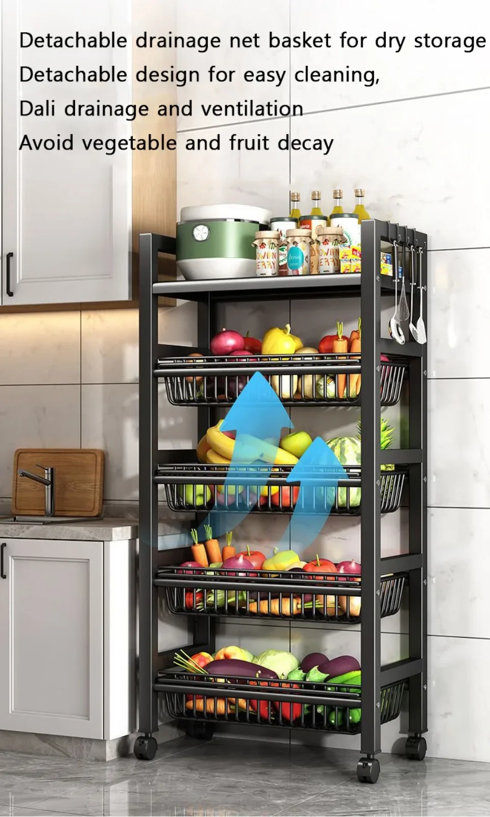 4. Detachable drainage net basket for dry storage, with a detachable design for easy cleaning. Dali drainage is well ventilated to prevent vegetable and fruit decay
