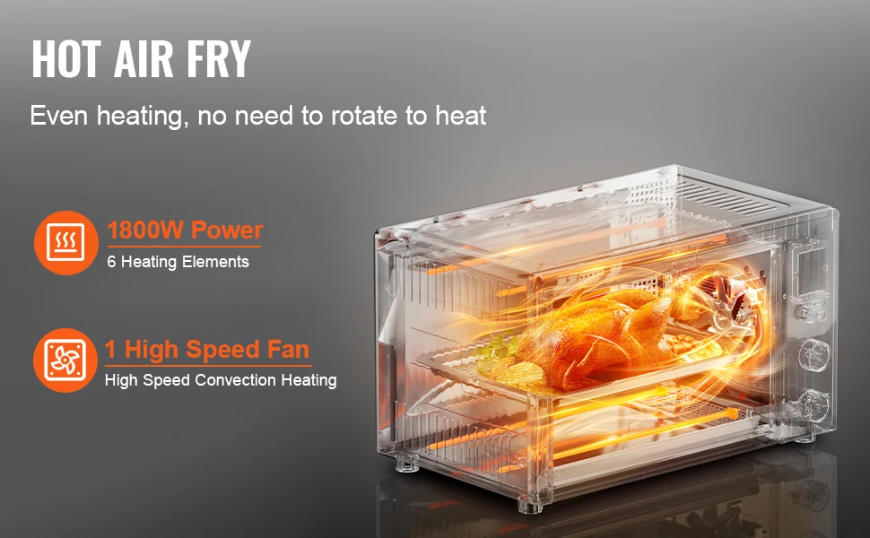 • Efficient Heating: With 1800W power, 6 heating elements, and a high-speed fan, this oven features 360° hot air circulation for even and fast heating. It ensures vibrant, delicious results, letting you enjoy star chef quality at home.